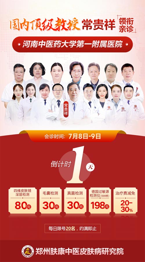 夏季高发皮肤病,联合会诊活动倒计时1天,郑州肤康特邀河南中医药大学第一附属医院皮肤科主任常贵祥坐诊,从事皮肤病专业33年,网上预约方便快捷,提前预约可免去您到院挂号和排队等候的烦恼,注意每天仅限20名。